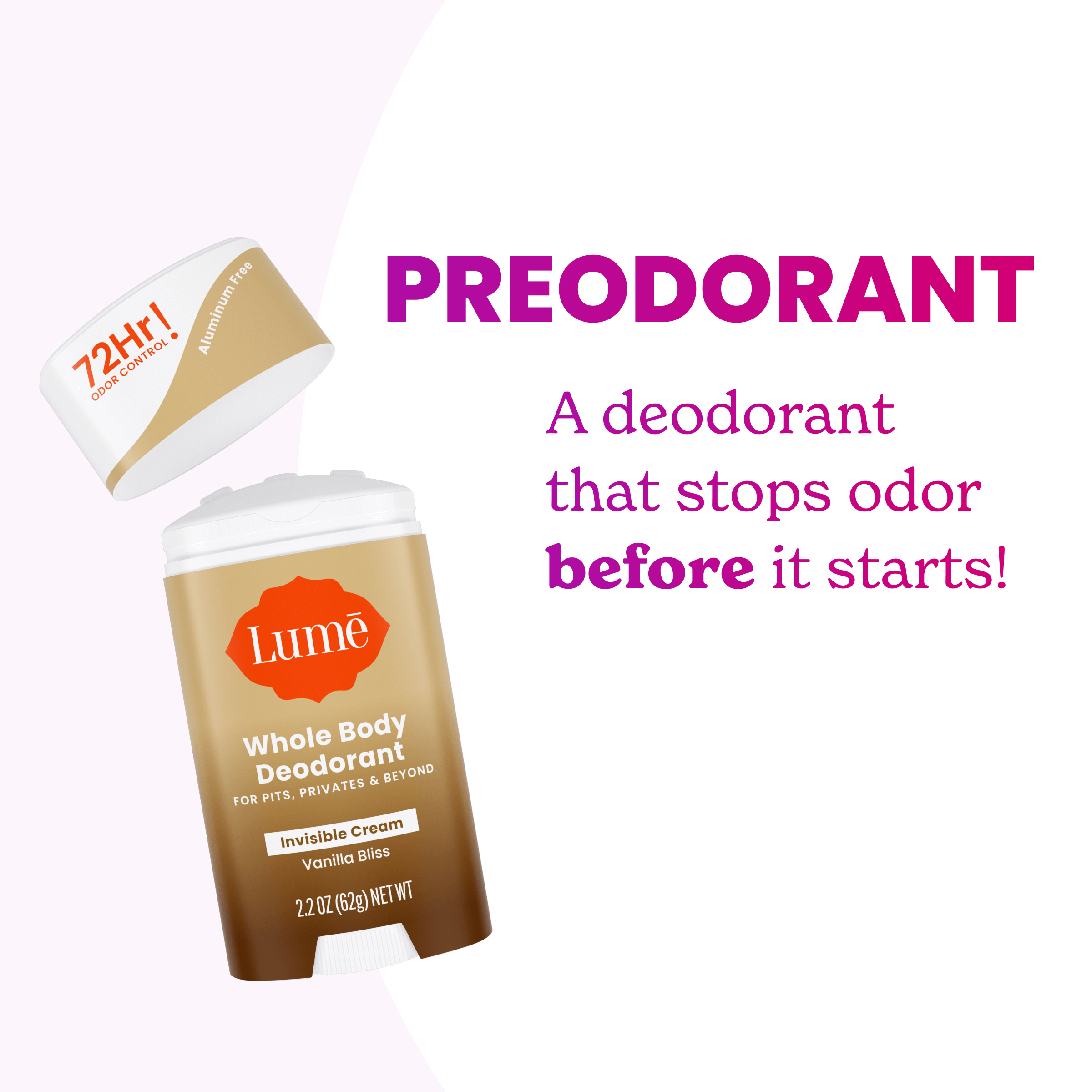 Clinically proven 72 hour odor controlClinically proven to visually even skin tone and decrease the appearance of hyperpigmentationClinically proven to brighten skin and reduce skin rednessSafe for any external useFormulated without aluminum, baking soda, or parabens